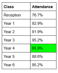 This week, our whole school attendance was low at 91.1% and with your help, I would love for us to meet our target of 96% next week. Our winning class was Year 4 who were so close to our target of 96% but just missed out on an extra playtime (try again next week!) and they won some new stationery on our Attendance Wheel!